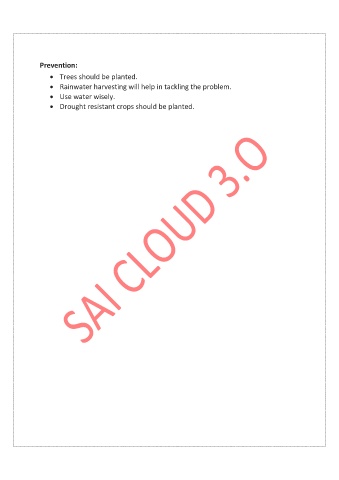 Prevention: Trees should be planted. Rainwater harvesting will help in tackling the problem. Use water wisely. Drought resistant crops should be planted.