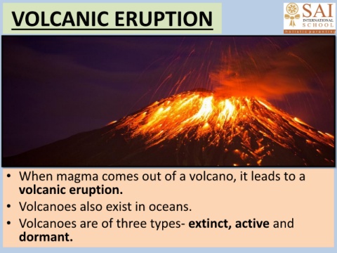 VOLCANIC ERUPTION • When magma comes out of a volcano, it leads to a volcanic eruption. • Volcanoes also exist in oceans. • Volcanoes are of three types- extinct, active and dormant.