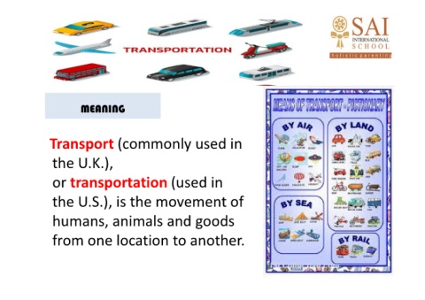 MEANING Transport (commonly used in T r a n s p o r t ( c o m m o n l y u s e d i n the U.K.), or transportation (used in the U.S.), is the movement of humans, animals and goods from one location to another.