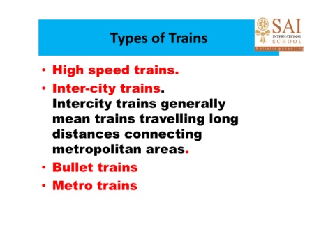 Types of Trains • High speed trains. • Inter-city trains. Intercity trains generally mean trains travelling long me a n t r a i n s t r a v e l l i n g l o n g distances connecting metropolitan areas. • Bullet trains • Metro trains
