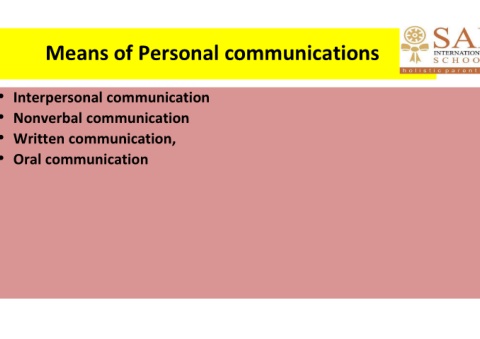 Means of Personal communications M e a n s o f P e r s o n a l c o m m u n i c a t i o n s • Interpersonal communication • Nonverbal communication • Written communication, • Oral communication