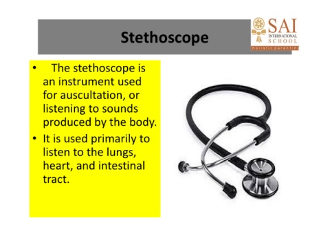 Stethoscope • The stethoscope is an instrument used for auscultation, or listening to sounds produced by the body. p r o d u c e d b y t h e b o d y . • It is used primarily to listen to the lungs, heart, and intestinal tract.