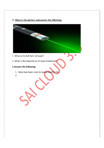 B. Observe the picture and answer the following: 1. What is the full form of Laser? 2. What is the importance of Laser treatment? C.Answer the following: 1. State two basic rules to lead a healthy life. 2.