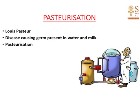 P A S T E U R I S A T I O N PASTEURISATION • Louis Pasteur i n a w s e e t n i m . k l d r e t n a e c u a s Di • Disease causing germ present in water and milk. s a e s m r r p e n i g g • Pasteurisation