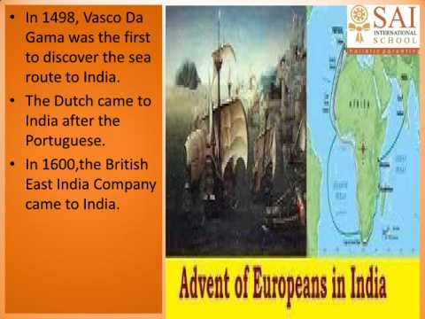 • In 1498, Vasco Da Gama was the first to discover the sea route to India. • The Dutch came to India after the Portuguese. • In 1600,the British East India Company came to India.