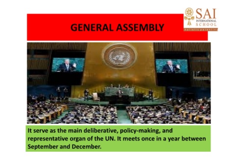 GENERAL ASSEMBLY It serve as the main deliberative, policy-making, and representative organ of the UN. It meets once in a year between September and December.