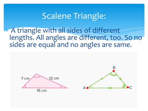 Scalene Triangle: A triangle with all sides of different lengths. All angles are different, too. So no sides are equal and no angles are same.