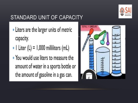 STANDARD UNIT OF CAPACITY • Standard unit of capacity is litre. • Capacity are measured by litre, millil.