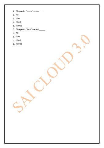 4. The prefix “hecto” means____ a. 10 b. 100 c. 1000 d. 10000 5. The prefix “deca” means _____. a. 10 b. 100 c. 1000 d. 10000