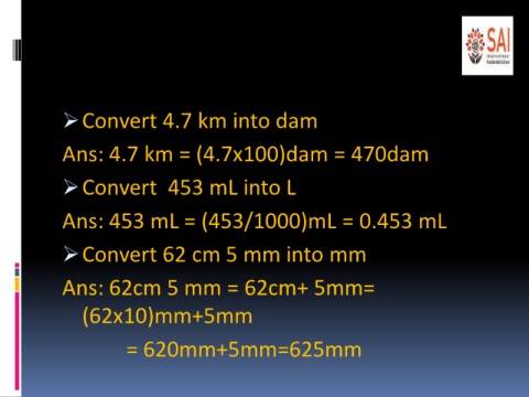 Convert 4.7 km into dam Ans: 4.7 km = (4.7x100)dam = 470dam Convert 453 mL into L Ans: 453 mL = (453/1000)mL = 0.453 mL Convert 62 cm 5 mm into mm Ans: 62cm 5 mm = 62cm+ 5mm= (62x10)mm+5mm = 620mm+5mm=625mm