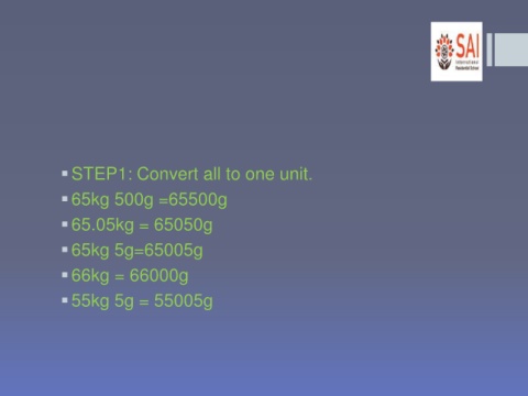 STEP1: Convert all to one unit. 65kg 500g =65500g 65.05kg = 65050g 65kg 5g=65005g 66kg = 66000g 55kg 5g = 55005g