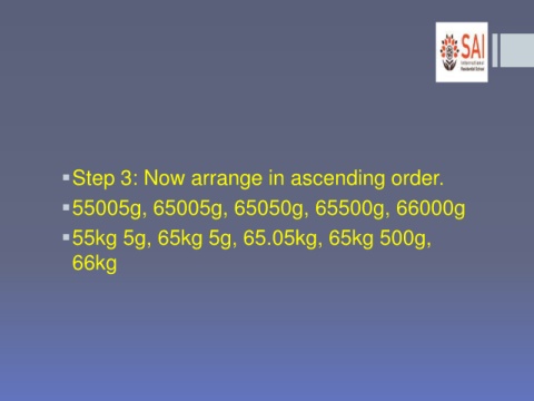 Step 3: Now arrange in ascending order. 55005g, 65005g, 65050g, 65500g, 66000g 55kg 5g, 65kg 5g, 65.05kg, 65kg 500g, 66kg