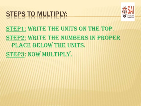 STEPS TO MULTIPLY: Step1: Write the units on the top. Step2: Write the numbers in proper place below the units. Step3: Now multiply.