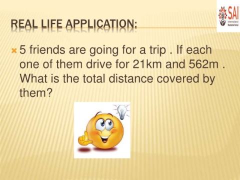 REAL LIFE APPLICATION: 5 friends are going for a trip . If each one of them drive for 21km and 562m . What is the total distance covered by them?