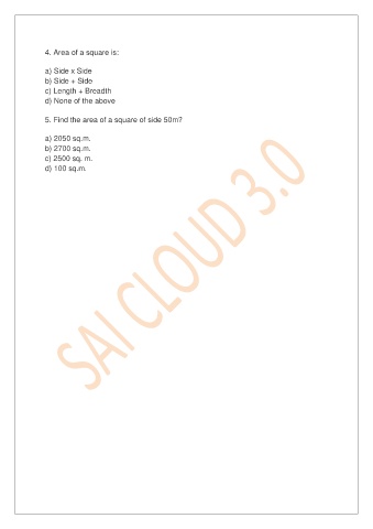 4. Area of a square is: a) Side x Side b) Side + Side c) Length + Breadth d) None of the above 5. Find the area of a square of side 50m? a) 2050 sq.m. b) 2700 sq.m. c) 2500 sq. m. d) 100 sq.m.