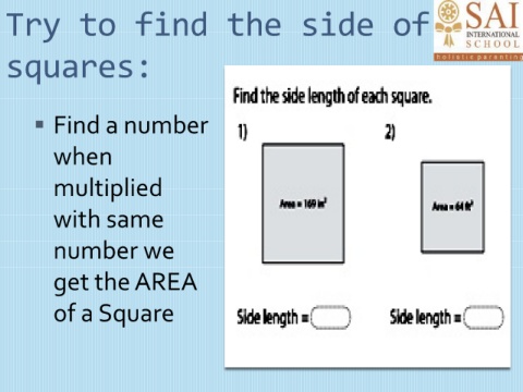 Try to find the side of squares: Find a number when multiplied with same number we get the AREA of a Square