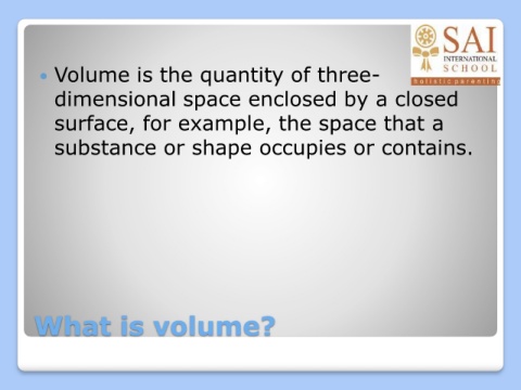 Volume is the quantity of three- dimensional space enclosed by a closed surface, for example, the space that a substance or shape occupies or contains. What is volume?