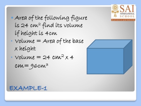 Area of the following figure is 24 cm find its volume 2 if height is 4cm • Volume = Area of the base x height 2 • Volume = 24 cm x 4 cm= 96cm 3 EXAMPLE-1