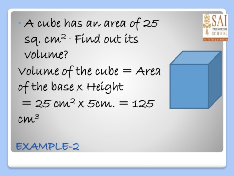 • A cube has an area of 25 sq. cm 2 . Find out its volume? Volume of the cube = Area of the base x Height 2 = 25 cm x 5cm. = 125 cm 3 EXAMPLE-2