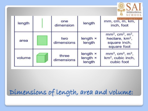 Dimensions of length, area and volume: