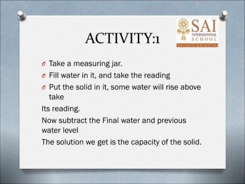 ACTIVITY:1 O Take a measuring jar. O Fill water in it, and take the reading O Put the solid in it, some water will rise above take Its reading. Now subtract the Final water and previous water level The solution we get is the capacity of the solid.
