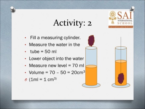 Activity: 2 • Fill a measuring cylinder. • Measure the water in the • tube = 50 ml • Lower object into the water • Measure new level = 70 ml • Volume = 70 – 50 = 20cm 3 O (1ml = 1 cm 3)