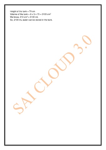 Height of the tank = 70 cm 3 Volume of the tank = 6 x 5 x 70 = 2100 cm 3 We know, 210 cm = 2100 mL So, 2100 mL water can be stored in the tank.