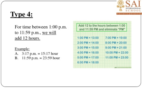 Type 4: For time between 1:00 p.m. to 11:59 p.m., we will add 12 hours. Example: A. 3:17 p.m. = 15:17 hour B. 11:59 p.m. = 23:59 hour