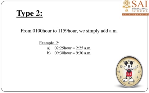 Type 2: From 0100hour to 1159hour, we simply add a.m. Example 2: a) 02:25hour = 2:25 a.m. b) 09:30hour = 9:30 a.m.