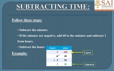 Follow these steps: • Subtract the minutes • If the minutes are negative, add 60 to the minutes and subtract 1 from hours. • Subtract the hours hours mins Example: 5 100 Carry 6 40 + 3 50 2 50 Answer