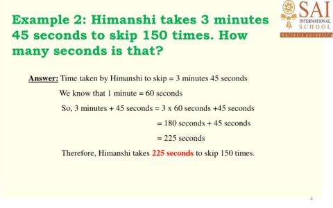 Answer: Time taken by Himanshi to skip = 3 minutes 45 seconds