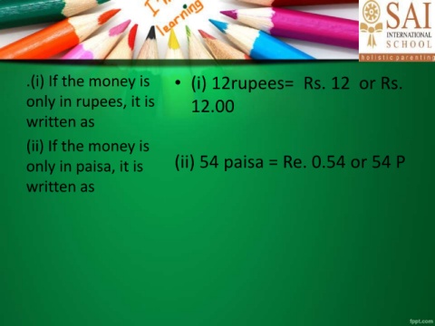 .(i) If the money is • (i) 12rupees= Rs. 12 or Rs. only in rupees, it is 12.00 written as (ii) If the money is only in paisa, it is (ii) 54 paisa = Re. 0.54 or 54 P written as