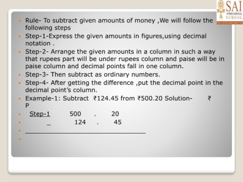 Example-1: Subtract ₹124.45 from ₹500.20 Solution- ₹