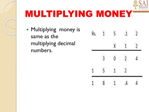 MULTIPLYING MONEY Multiplying money is same as the multiplying decimal numbers.