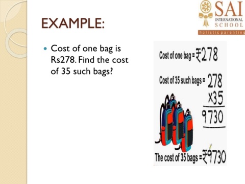 EXAMPLE: Cost of one bag is Rs278. Find the cost of 35 such bags?