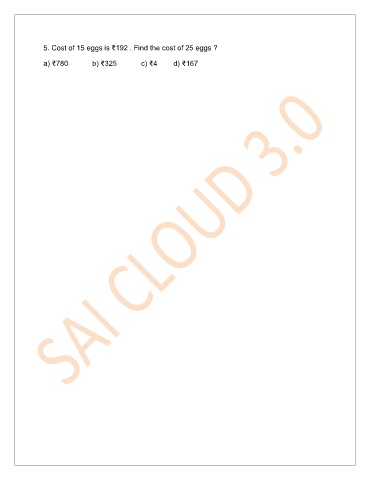 5. Cost of 15 eggs is ₹192 . Find the cost of 25 eggs ? a) ₹780 b) ₹325 c) ₹4 d) ₹167
