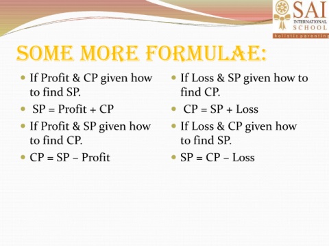 SOME MORE FORMULAE: If Profit & CP given how If Loss & SP given how to to find SP. find CP. SP = Profit + CP CP = SP + Loss If Profit & SP given how If Loss & CP given how to find CP. to find SP. CP = SP – Profit SP = CP – Loss