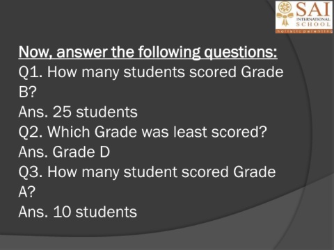 Now, answer the following questions: Q1. How many students scored Grade B? Ans. 25 students Q2. Which Grade was least scored? Ans. Grade D Q3. How many student scored Grade A? Ans. 10 students