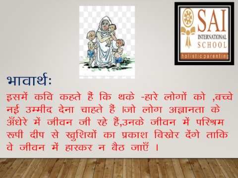 HkkokFkZ% blesa dfo dgrs gSa fd Fkds &gkjs yksxksa dks ]cPps ubZ mEehn nsuk pkgrs gSa Atks yksx vKkurk ds v¡/ksjs esa thou th jgs gSa]muds thou esa ifjJe :ih nhi ls [kqf’k;ksa dk izdk’k fc[ksj nsaxs rkfd os thou esa gkjdj u cSB tk,¡ A