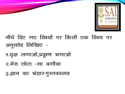 uhps fn, x, fo”k;ksa ij fdlh ,d fo”k; ij vuqPNsn fyf[k, & 1-o`{k yxkvks]iznw”k.k Hkxkvks 2-esjk NksVk &lk cxhpk 3-Kku dk HkaMkj&iqLrdky;