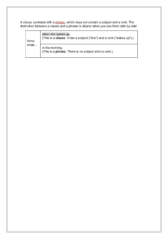 A clause contrasts with a phrase, which does not contain a subject and a verb. The