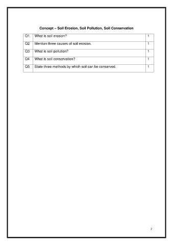 Concept – Soil Erosion, Soil Pollution, Soil Conservation Q1. What is soil erosion? 1 Q2 Mention three causes of soil erosion. 1 Q3 What is soil pollution? 1 Q4 What is soil conservation? 1 Q5 State three methods by which soil can be conserved. 1 2