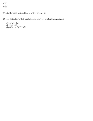 (c) 3 (d) 4 7) write the terms and coefficients of 3 – xy + yz – xz. 8) Identify the terms, their coefficients for each of the following expressions: 2 (i) 5xyz – 3zy (ii) 1 + x + x 2 2 2 2 (iii) 4x y – 4x y z + z 2 2 2