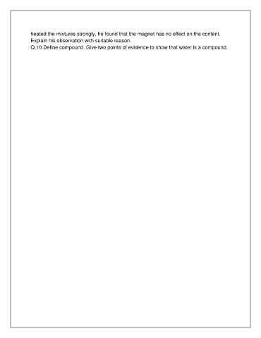heated the mixtures strongly, he found that the magnet has no effect on the content. Explain his observation with suitable reason. Q.10.Define compound. Give two points of evidence to show that water is a compound.