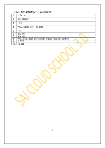 HOME ASSIGNMENT-1 ANSWERS 1. c. 54 2 2 2. 6m, 216cm 3. 15 m 4. TSA= 94500 cm 2 , Rs.1890 5. 11cm 6. 360 cm 2 7. Ans. 6m 8. Ans. Area= 4250 cm , length of tape needed = 320 cm 2 9. Rs. 28800 10. Rs 555 2