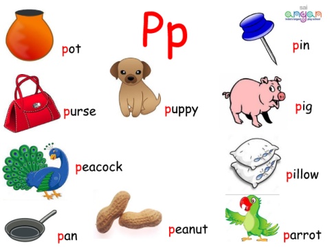Pp pot pin purse puppy pig peacock pillow pan peanut parrot