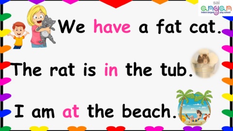 We have a fat cat. The rat is in the tub. I am at the beach.