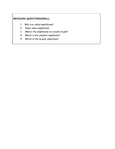 REVISION QUESTIONS(ORAL)- 1. Who are called amphibians? 2. Name some amphibians. 3. Where the amphibians are mostly found? 4. Which is the smallest amphibian? 5. Which is the largest amphibian?