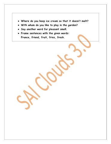 ● Where do you keep ice cream so that it doesn’t melt? ● With whom do you like to play in the garden? ● Say another word for pleasant smell. ● Frame sentences with the given words: France, friend, fruit, fries, fresh.