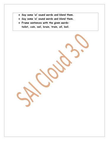 ● Say some ‘ai’ sound words and blend them. ● Say some ‘oi’ sound words and blend them. ● Frame sentences with the given words: toilet, coin, soil, brain, train, oil, boil.